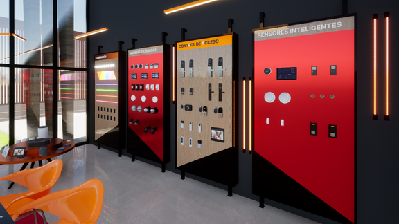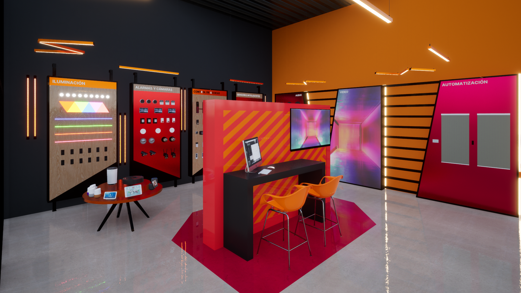 Con la finalidad de crear un ambiente didáctico y donde pudiera el cliente vivir la experiencia de la tecnología de una casa inteligente, así como de otros sistemas; este diseño de tienda cuenta con diversos displays para la muestra e interacción de los equipos en venta.