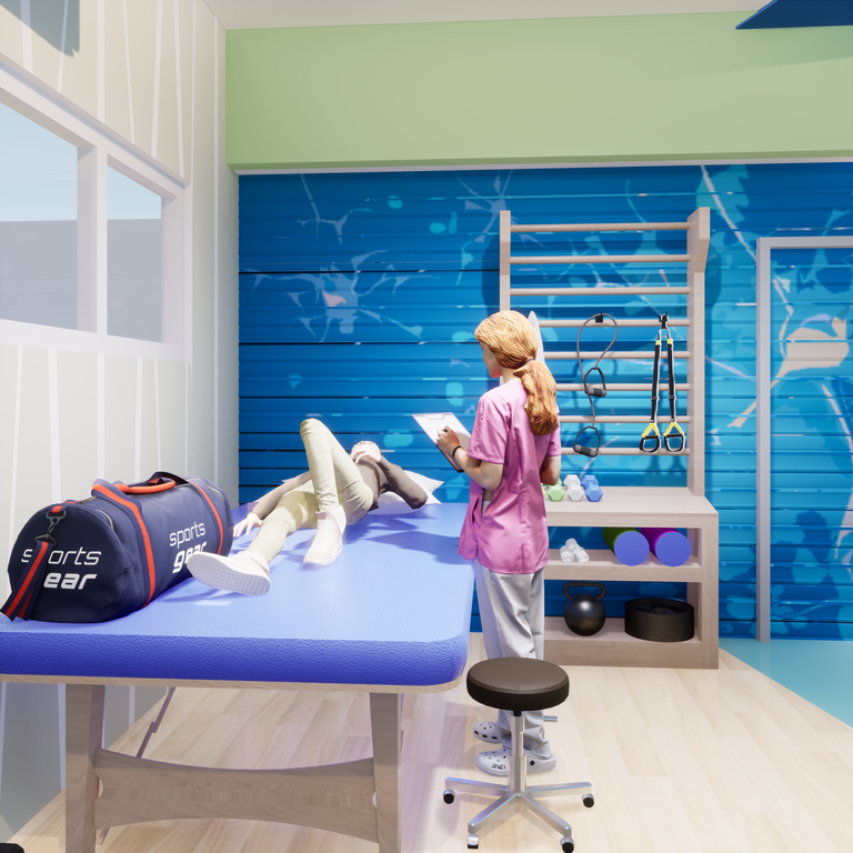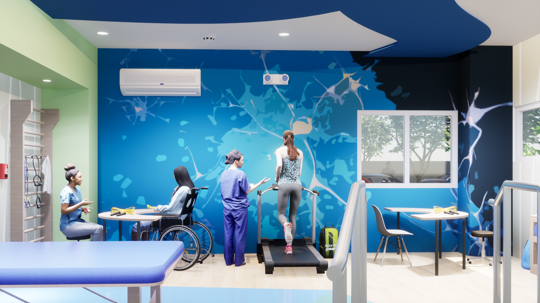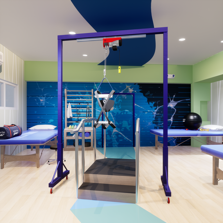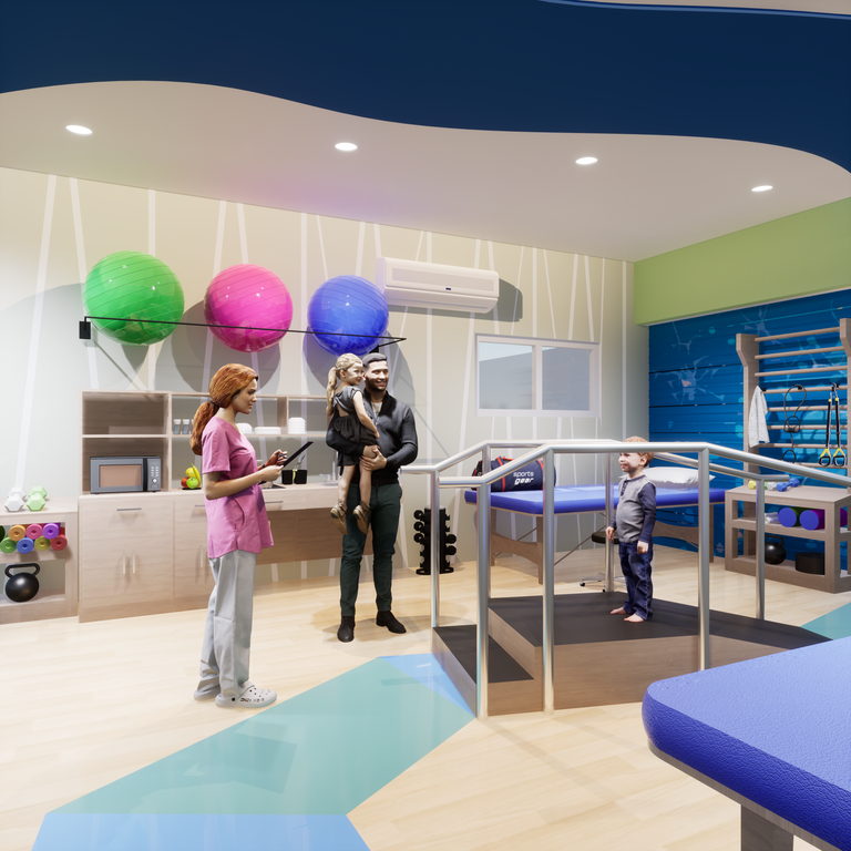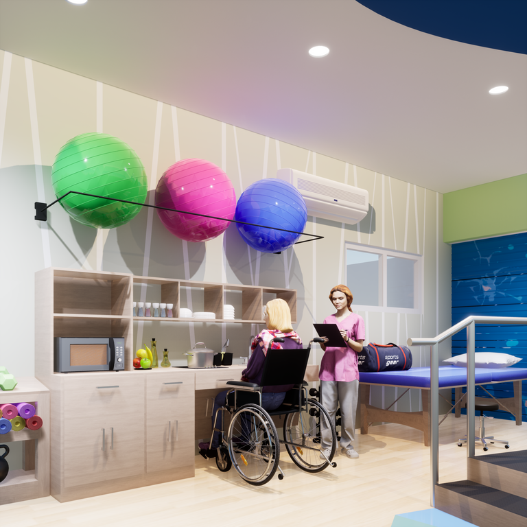 Con la finalidad de ampliar el área de terápia de fisioterapia neurológica, se diseño un espacio que contara con diversas estaciones para una varidedad de tratamientos. El espacio consta de 3 camillas de masajes, 2 mesas de terapia, módulo de cocineta para terapia ocupacional y un pequeño circuito para iniciar la marcha con grúa de bipedestación móvil
